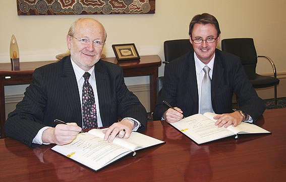 From left: Vice-Chancellor and President Professor James McWha and Qantas Engineering Group General Manager Technical Services David Kelly