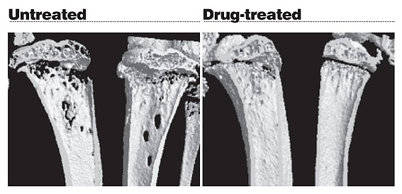 In vivo micro-CT imaging of the tibia shows areas of bone destruction and the result after drug treatment