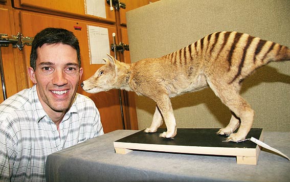 Dr Jeremy Austin with a mounted specimen of a baby thylacine from the SA Museum