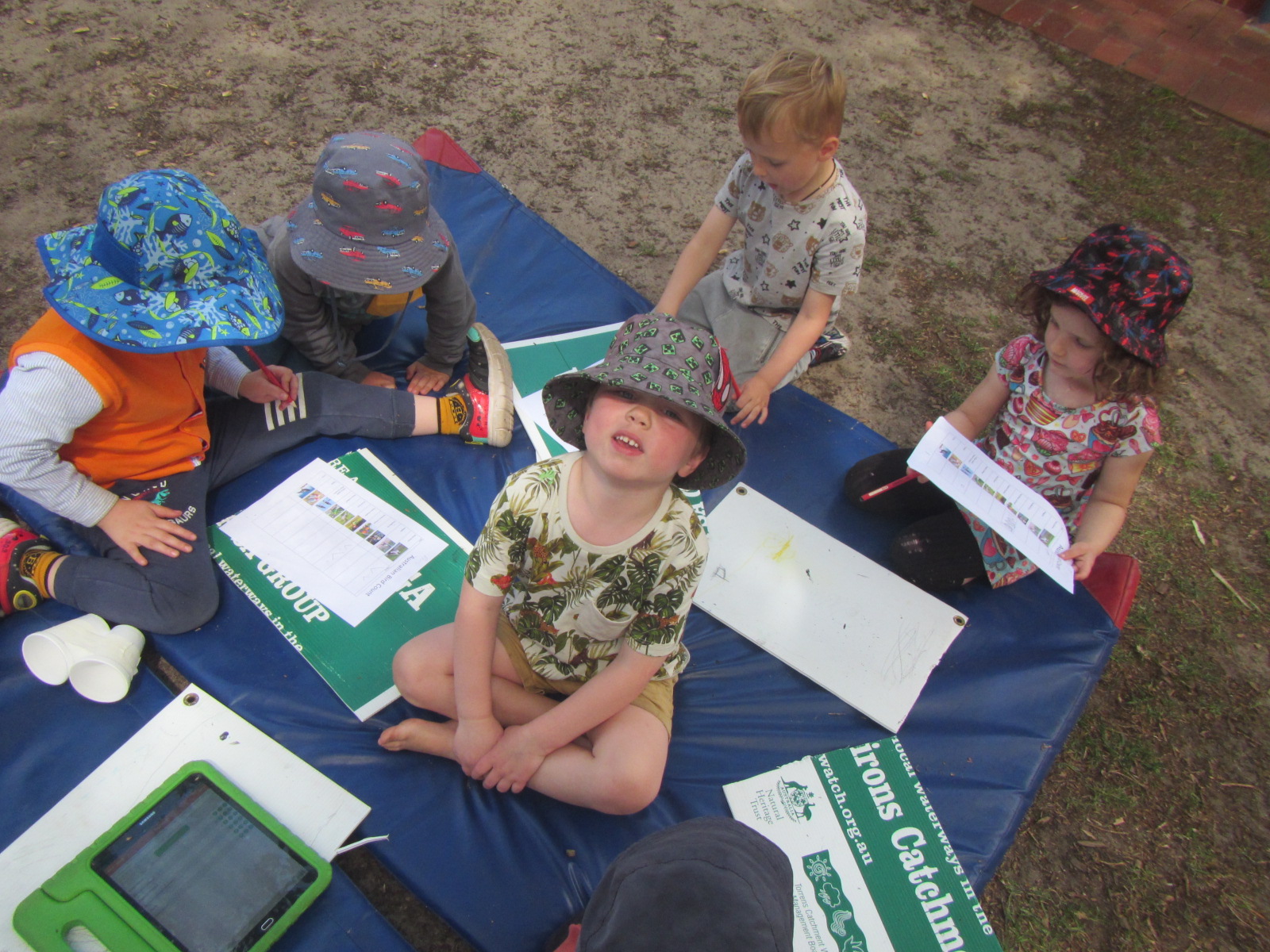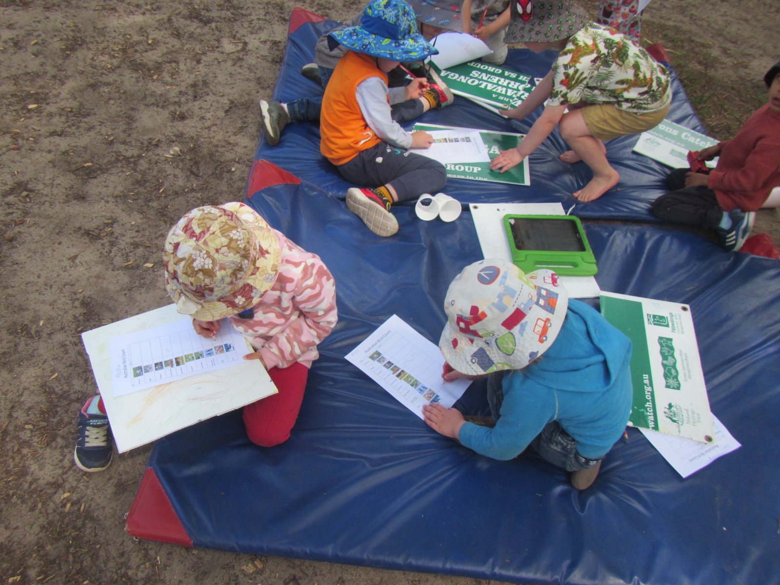 Celebrating National Bird Week is an annual event at Waite. This is the fourth year that the children and educators have undertaken bird surveys and contributed to the data collection about the birds that live around WCCC. The children were very excited about bird watching again this year. During Bird Week it occurs in a more formal way than what usually happens at the Centre as bird watching is always an interest of the children. They were able to confidently recall last year’s bird watching sessions and were eager to get their observation record sheet and participate. The passionate children from Room 3 joined me on the grass area and also spent some time during the morning down in Pilyabilyangga observing birds. The children had their own piece of paper to record the birds they saw and I had the tablet to record our sightings on the official survey. Each time a small group of children joined in and some children actively participated every time. Some of the experienced Room 3 bird watchers who had well developed bird identification skills were able to help other children identify which bird flew over and also how to record their observations on their page.