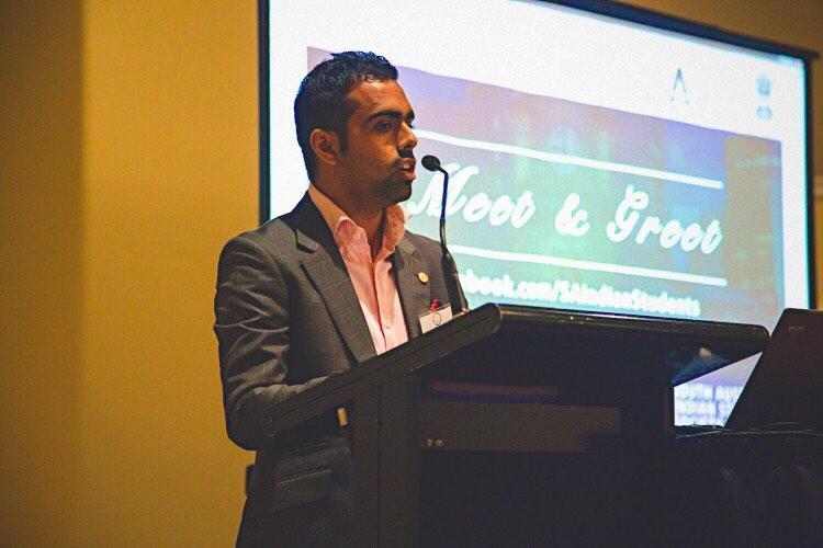 Anmol giving a welcome speech at a meet and greet event in Adelaide Town Hall, to the Lord Mayor of the City of Adelaide, The Hon. Consul General of India, and newly arrived Indian students.
