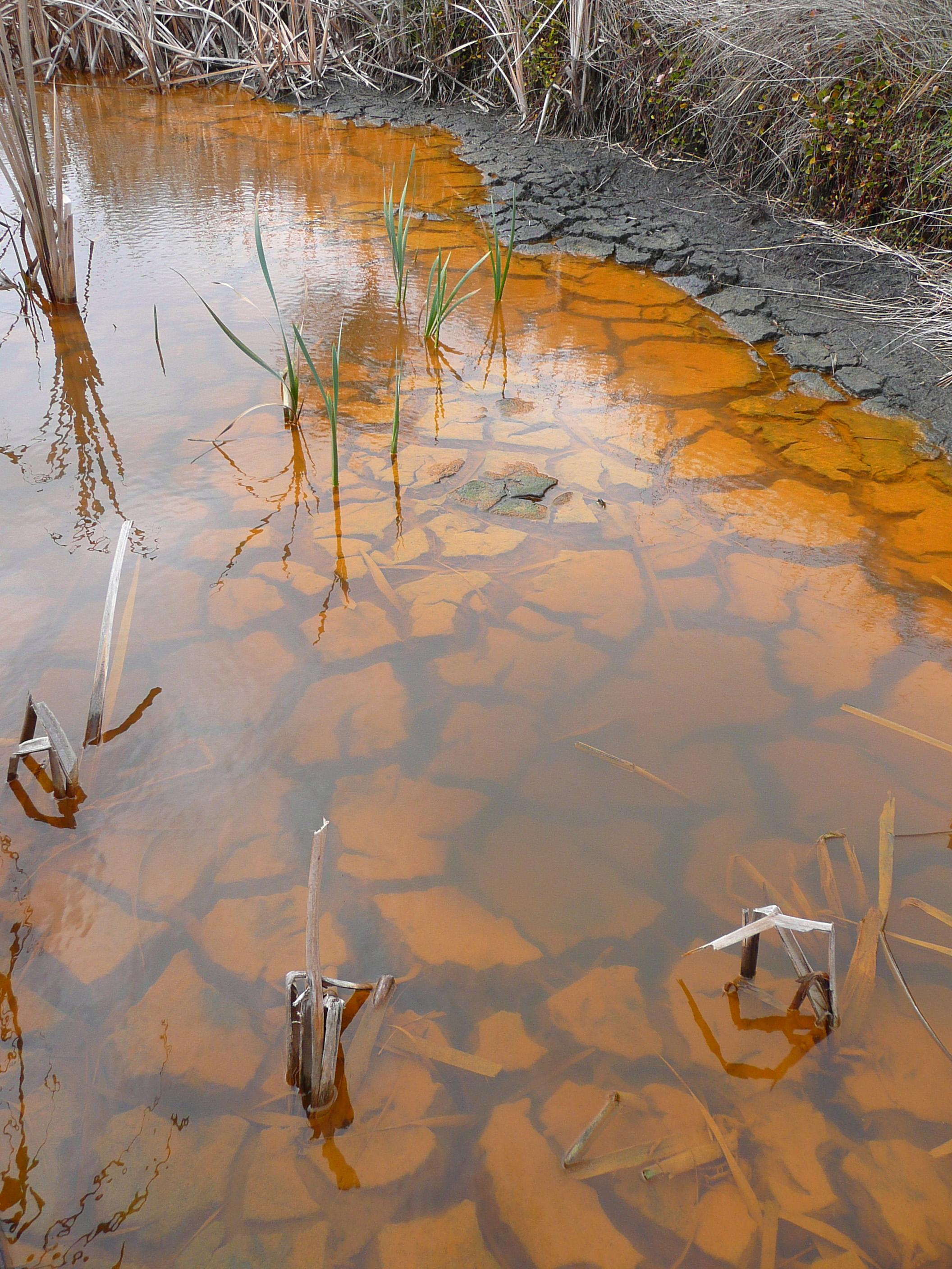 Acidic (pH 4) and iron rich (indicated by orange-brown colour) water in a wetland following exposure during drought. Credit: Luke Mosley